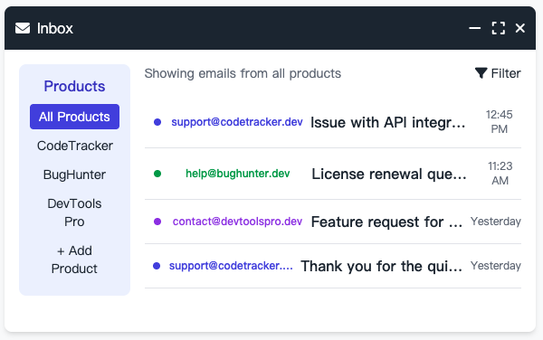 Manage support emails for all your products from a single dashboard - no more switching between accounts.